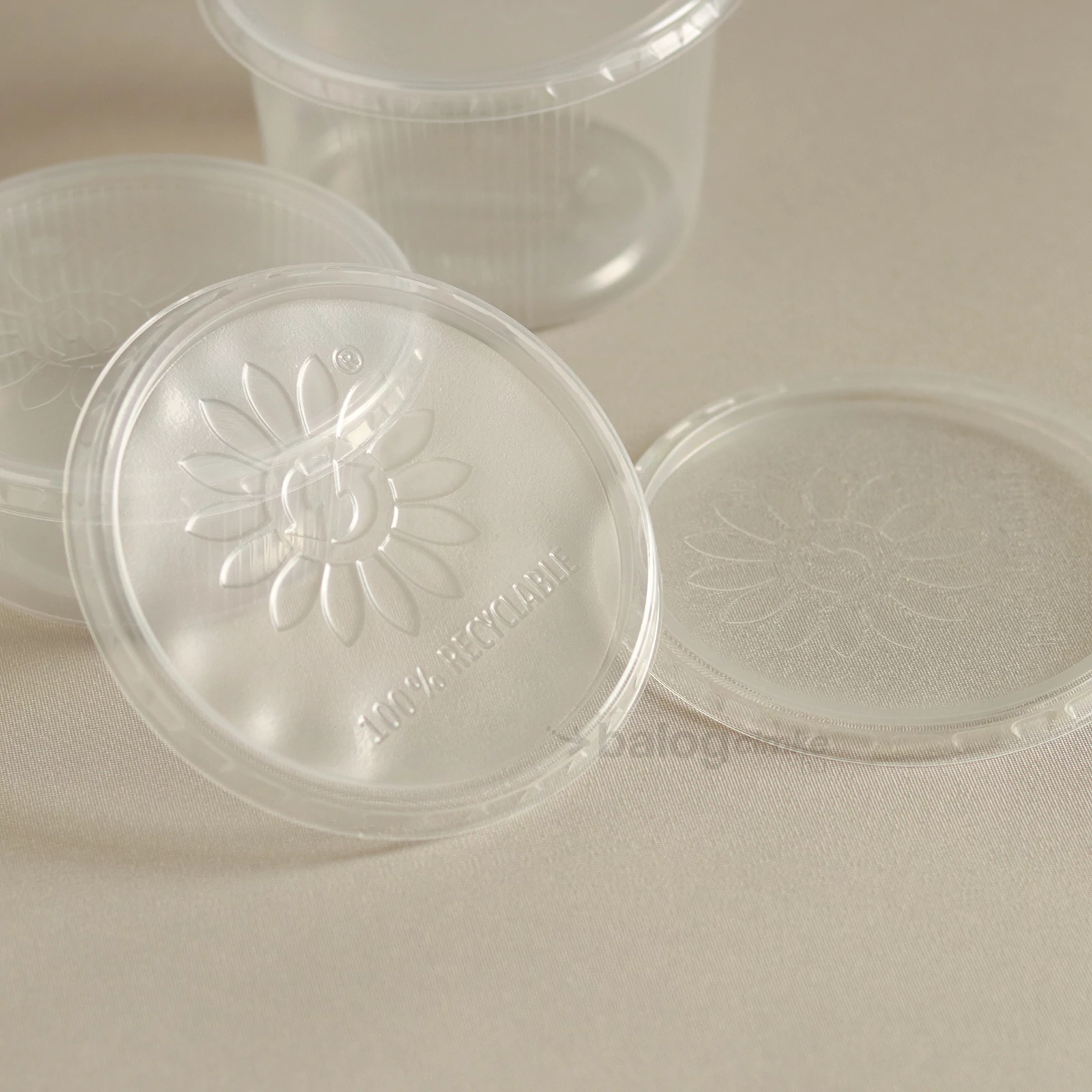 Műanyag, újrahasznosítható anyagból készült átlátszó tető a 200 ml és 300 ml-es tégelyekhez. Ez a tető mindkét mérethez használható. Csak a műanyag tégelyekhez illeszkedik. Mérete: 10 cm.